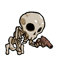 Skeleton can be unlocked on Nuclear Throne Together (NTT) by transforming into him. He then appears on the character select screen with his own crowns/golden weapon unlocks, with Rusty Revolver as his default starter. He is also given a NTT B-Skin unlock if he fires the Gun Gun.