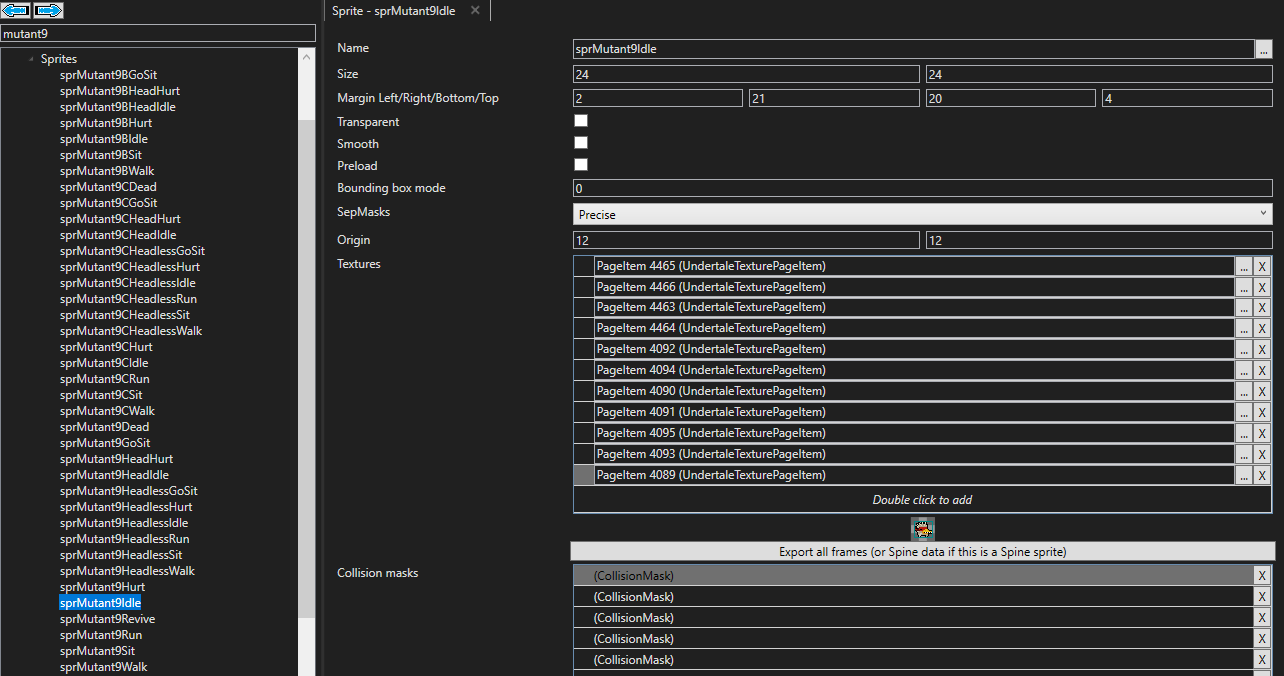 Once data.win is opened with UMT, the search bar can be used to search for any specific sprites. Here is an example image of how it would look, searching for 'Mutant9' for all the Chicken sprites: