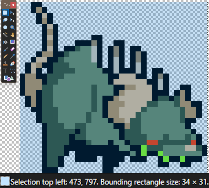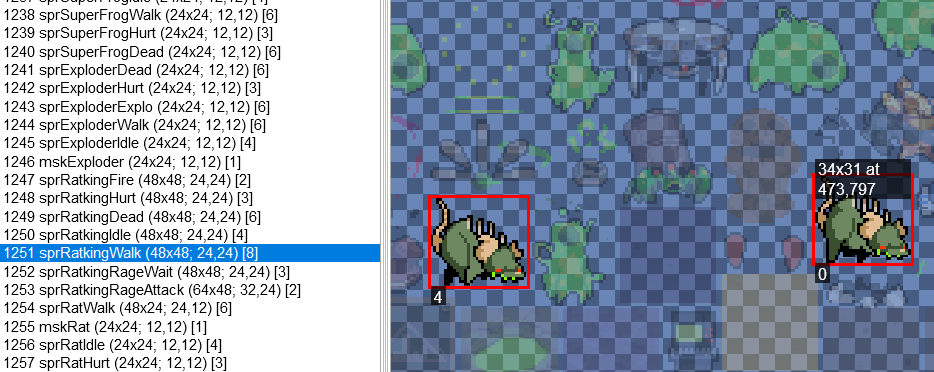 Mousing over a specific sprite will show its sprite size which it can be edited within, in this example being 34 x 31 pixels. The other number refers to its X and Y coordinates on the spreadsheet, being 473, 797 in this example.