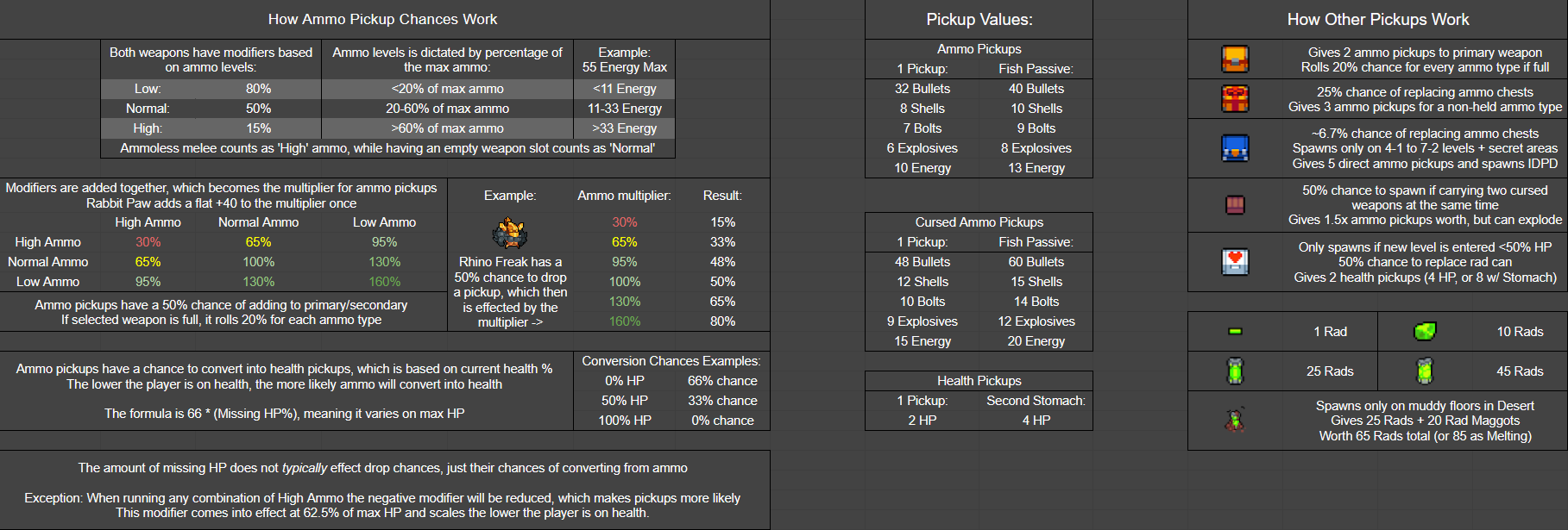 Stomach. Ammo pickups that drop from enemies have a chance of being converted into health pickups. The odds of ammo converting is based on the missing percentage of max HP. This means the lower the player is on health, the more likely ammo will be converted. The exact formula is 66 * (Missing HP%), meaning it is dependent on max HP. The max chance to convert ammo is 66% at 0 HP (Headless Chicken), while being at max health puts it at a 0% chance. Typically health levels will not affect enemy drops. The exception to this is when running any combination of weapons that are high on ammo; their negative modifiers will be reduced when low on HP to make drops more common. This starts at 62.5% of max HP and will scale the lower the player is on health. |